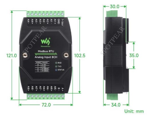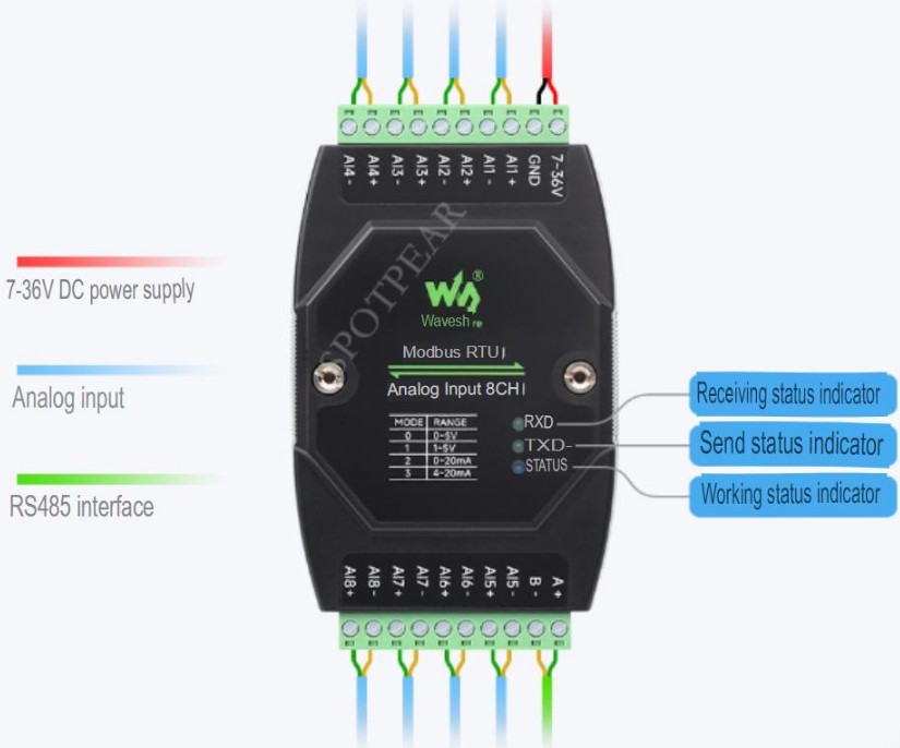• Mode input dapat dipilih menggunakan konfigurasi MODE internal (kemungkinan via register Modbus atau dipilih melalui jumper/config switch).